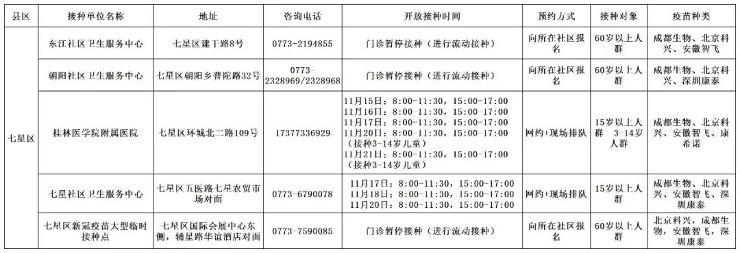 七星区2022年11月15日-2022年11月21日新冠病毒疫苗接种门诊公示