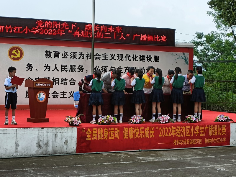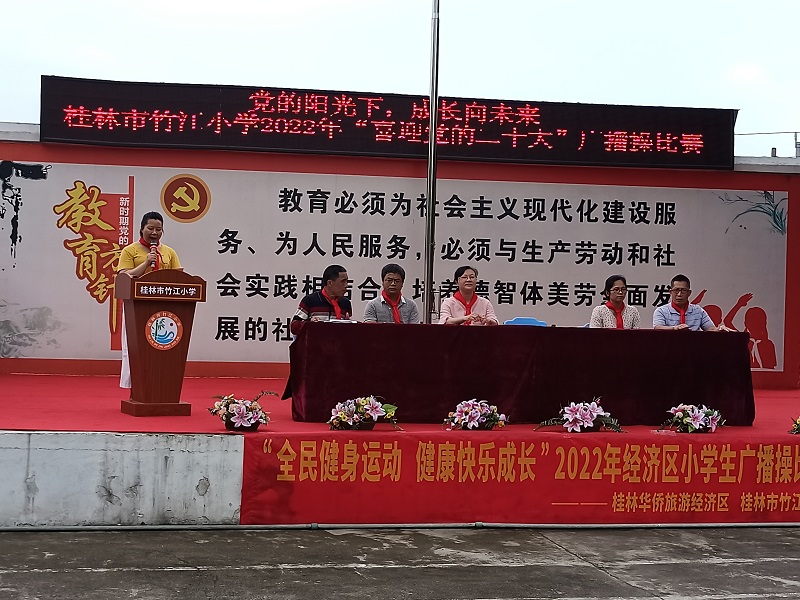 为丰富学生的校园生活,增强学生团结协作的精神,推进学校阳光体育蓬勃发展。4月27日下午,桂林华侨旅游经济区联合桂林市竹江小学举行了“全民健身运动 健康快乐成长”小学生广播操比赛。竹江小学全体师生参加了活动,华侨旅游经济区工委委员、管委会副主任、妇联主席唐艳霞出席活动并致开幕词。