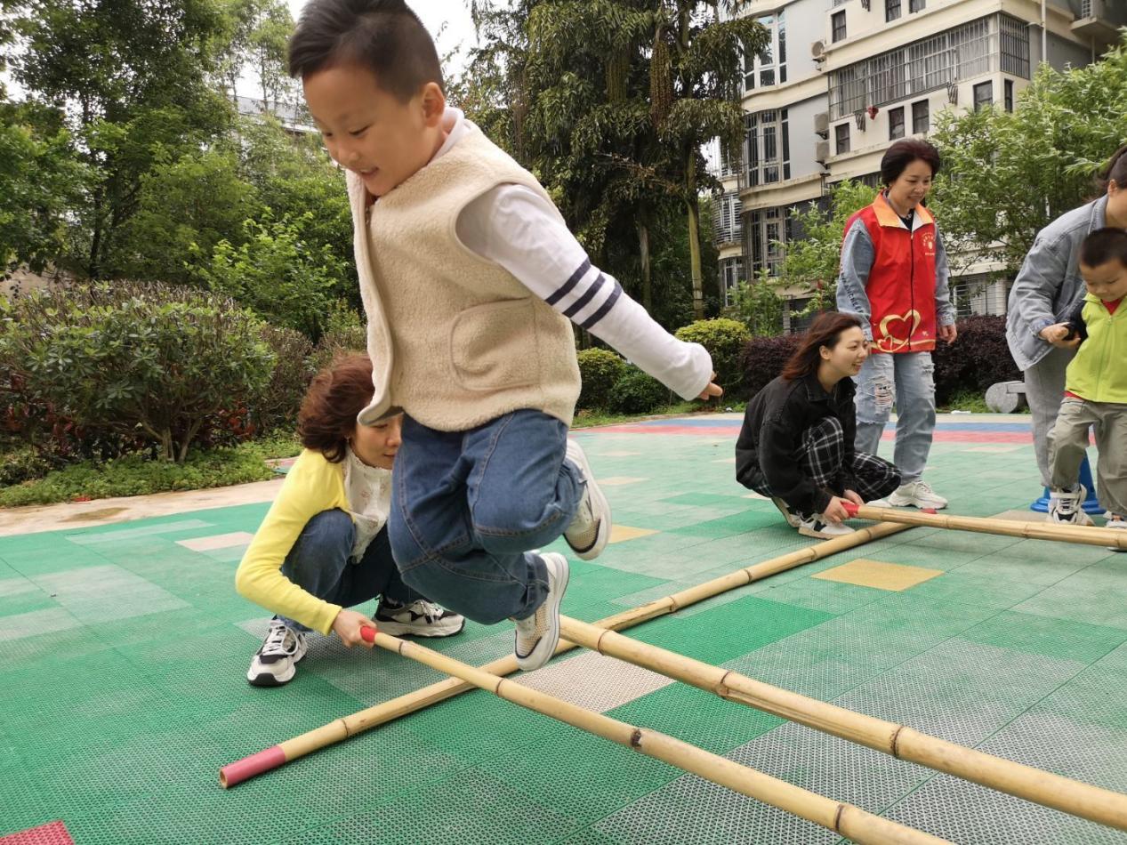 活动现场,社区妇联成员、青年志愿者和幼儿园老师指导孩子们有序排队跳竹竿舞。“开、合、开、合、开开合。”在有节奏、有规律的碰击声和音乐里,孩子们和志愿者大手拉小手欢跳竹竿舞,享受传统运动的乐趣,传承民族文化。接着就是在老师的指导下有节奏地原地拍皮球,“一二一二,下蹲、起来,腿不动,动腰。”刚开始孩子们都无法很好的掌握技巧,总是控制不住球,后来逐渐找到规律,大家整齐划一,乐此不疲。