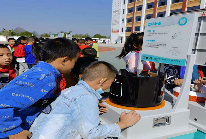 “我们学校的孩子大多数来自附近农村,他们很少有这样的机会与这么多科学展品零距离接触。‘科普大篷车’开进桂林华侨中学、华侨小学,打开学生们热爱科学的大门,拓宽学生们的眼界,激发他们对科学的兴趣。”桂林华侨小学副校长蒋聪开心地说道。