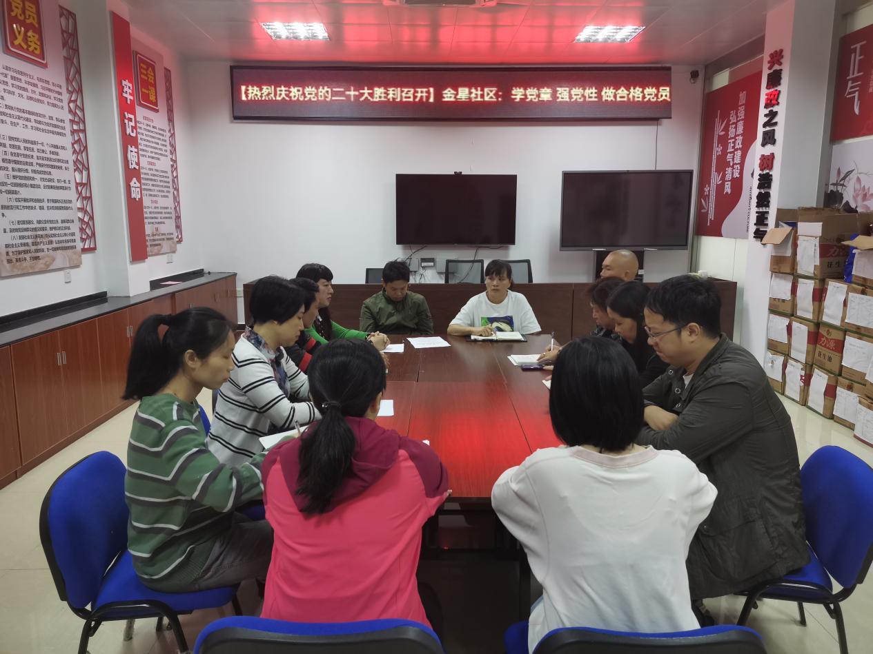 为热烈庆祝中国共产党第二十次全国代表大会胜利召开,增强党员责任担当,提升党员党性修养,从党章中感悟初心和使命。近日,金星社区开展“学党章强党性做合格党员”主题党日活动。金星社区包点领导七星街道办事处武装部部长艾如钢列席旁听。金星社区党委书记秦秋英从党章的发展历史、重大意义及党的组织体系建设三个方面对党章进行了解读。强调党员要将党章学习与实际行动结合起来,切实履行党员义务,在新征程上充分发挥先锋模范作用。一要提高履行党员义务的政治自觉。要认真学习党章党规、习近平总书记系列重要讲话精神,不断强化责任意识,始终把履行党员义务放在重中之重的位置。二要切实履行党员义务。党员不仅要牢固树立履行义务的责任意识,而且要把它贯彻到行动中,在日常工作、学习与生活中,在各个方面起到先锋模范作用。三要以党章规定的党员义务为镜子,经常对照检查自己的差距,始终把党和人民的利益放在第一位。