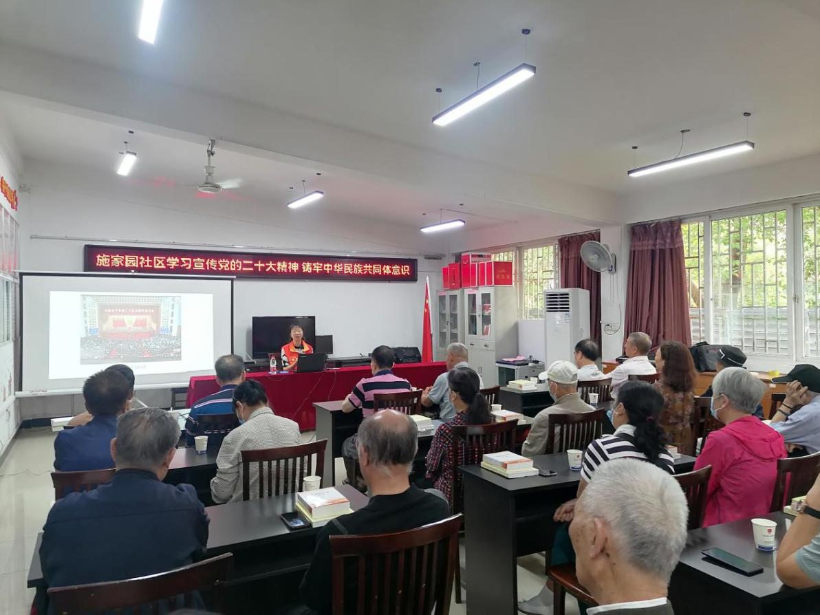 党的二十大是一次高举旗帜、凝聚力量、团结奋进的大会,为让社区广大党员深刻领会党的二十大精神。2022年10月26日上午,施家园社区特邀桂林市委党校副教授卢雪艳给社区党员作《学习宣传党的二十大精神,铸牢中华民族共同体意识》主题宣讲。社区党员及入党积极分子齐聚二楼新时代文明实践站,全神贯注听完卢雪艳副教授的“接地气”宣讲,让党的二十大精神与广大党员“零距离”接触,打通党的创新理论传播“最后一公里”。