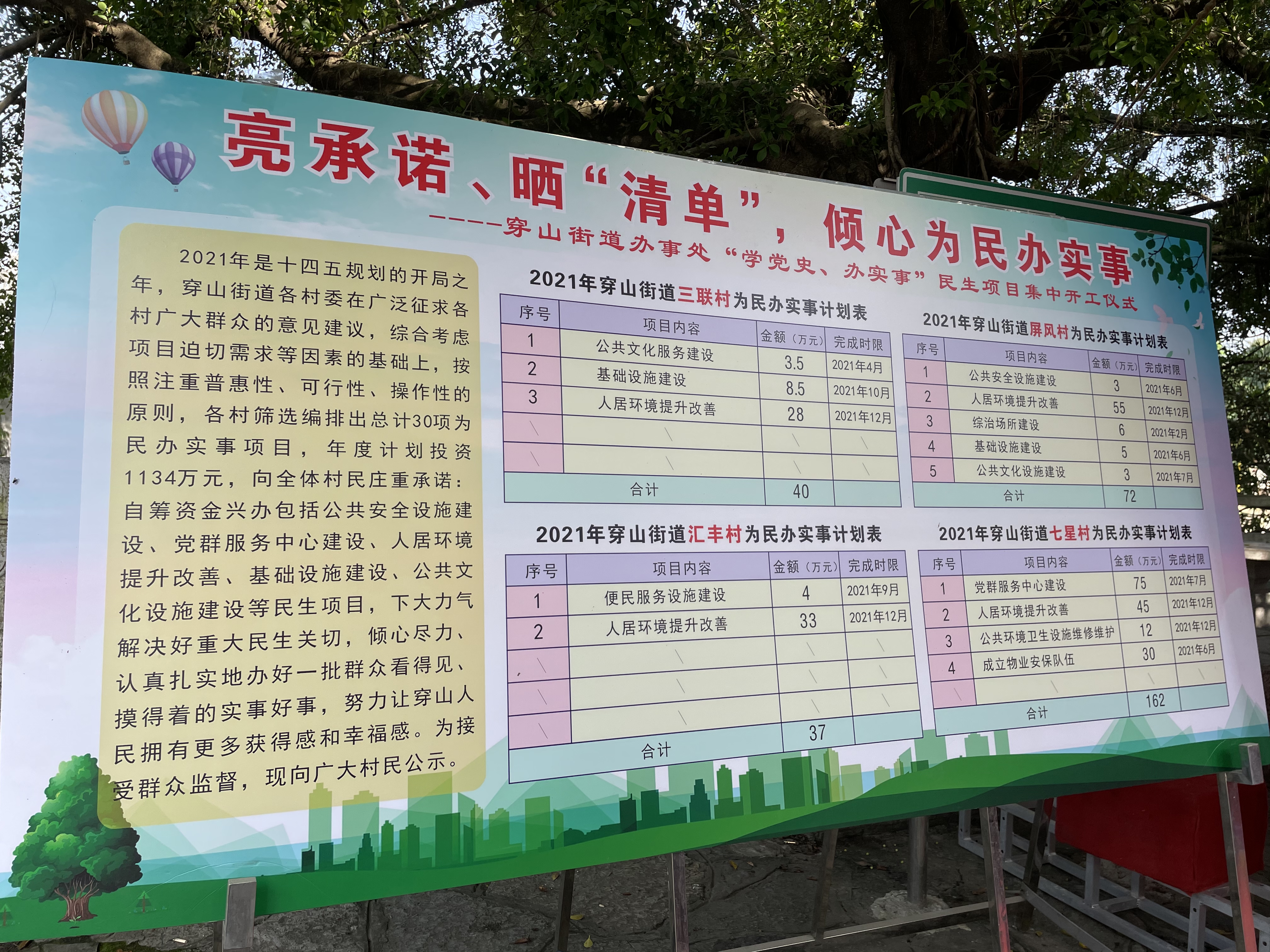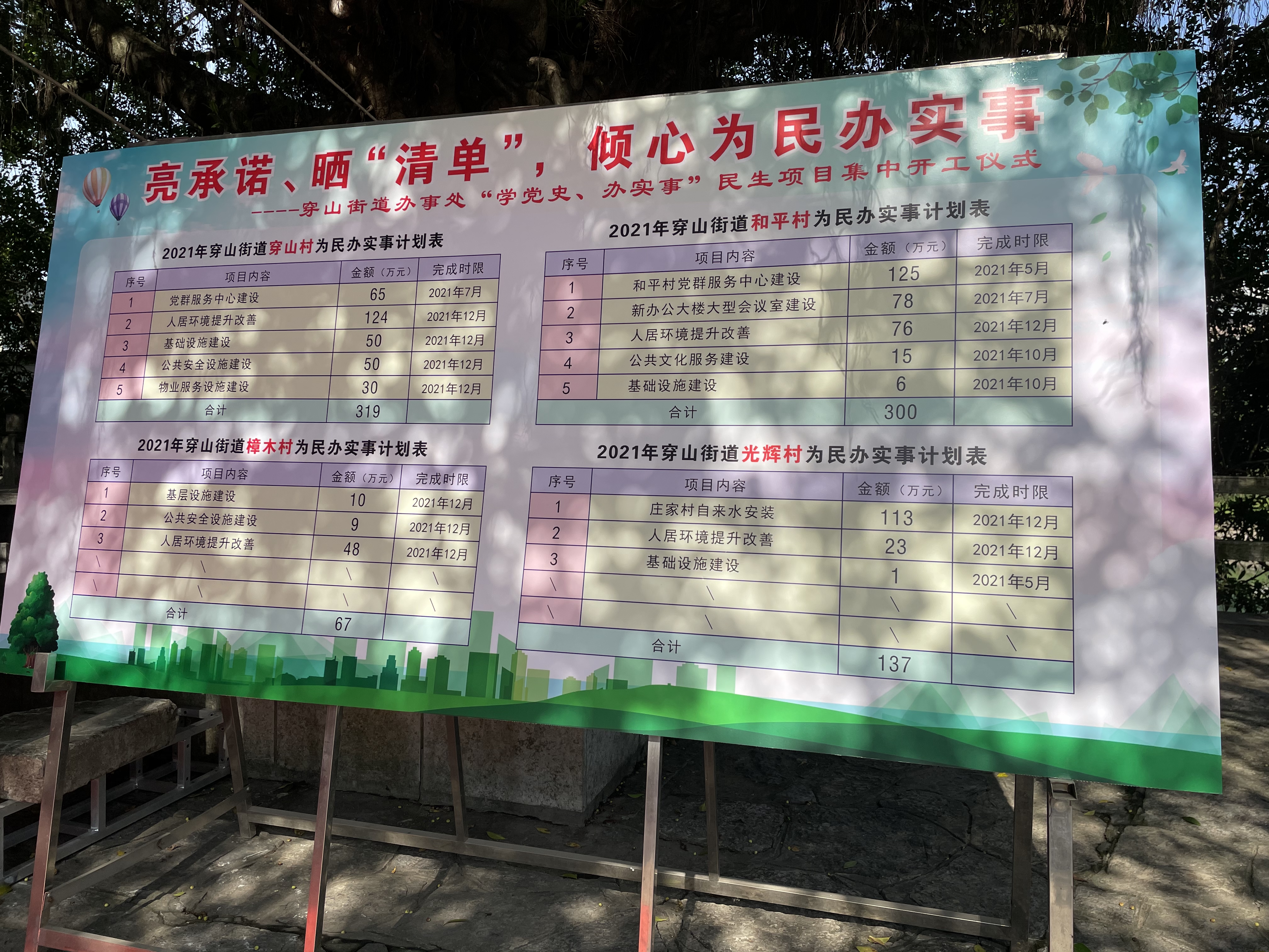 为实现“十四五”开门红,努力改善辖区人居环境,不断提升群众生活幸福感,穿山街道各村广泛征求辖区广大群众的意见建议的基础上,综合考虑项目迫切需求等因素,注重普惠性、可行性、操作性的原则,按照“切口小、发力准、效果好”的标准,条目式提出“我为群众办实事”重点工作清单,梳理编排出涉及党群服务中心建设、公共文化服务建设、公共安全设施建设、人居环境提升改善、便民服务设施建设等10方面30项为民办实事项目,预计年度投资1134万元。各村自筹资金兴办包括饮水安全、收入增长、交通出行、水利工程、教育卫生、托底保障、文化体育等类别,下大力气解决好重大民生关切,倾心尽力、认真扎实地办好一批群众看得见、摸得着的实事好事,努力让穿山人民拥有更多获得感和幸福感。此次集中开工仪式,将标志着穿山街道“十四五”规划的起步、乡村振兴的全面推进。