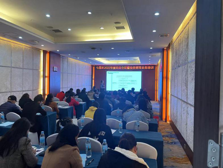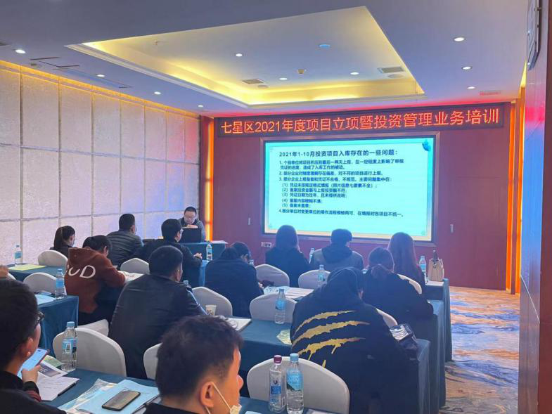 为做好2021年项目立项暨投资领域工作,2021年11月11日上午,七星区发改局在维也纳酒店二楼国际厅组织召开2021年度项目立项管理暨投资领域业务培训会议,区城建局、商务局、工信局、园区局、农工局、教育局和一乡四办分管领导和具体负责同志以及23家企业负责同志参加了培训。