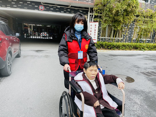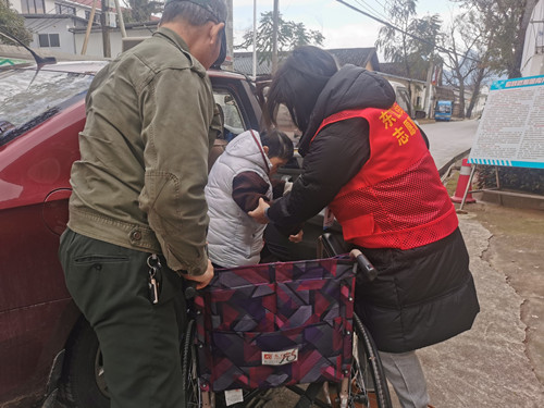 2月23日上午,朝阳社区新时代文明实践站、计生协的志愿者到中医院接特困户刘彩娥回养老院。
