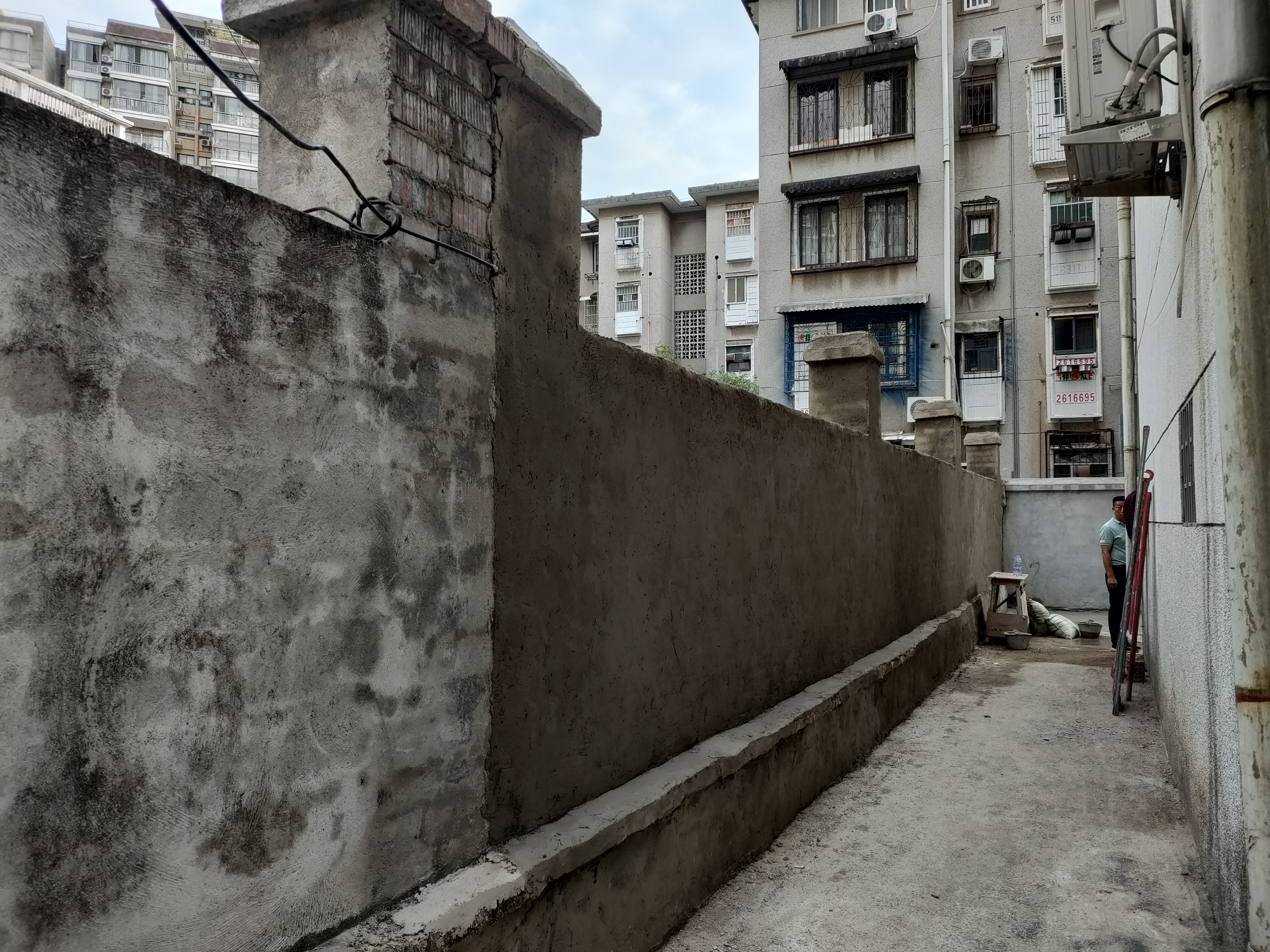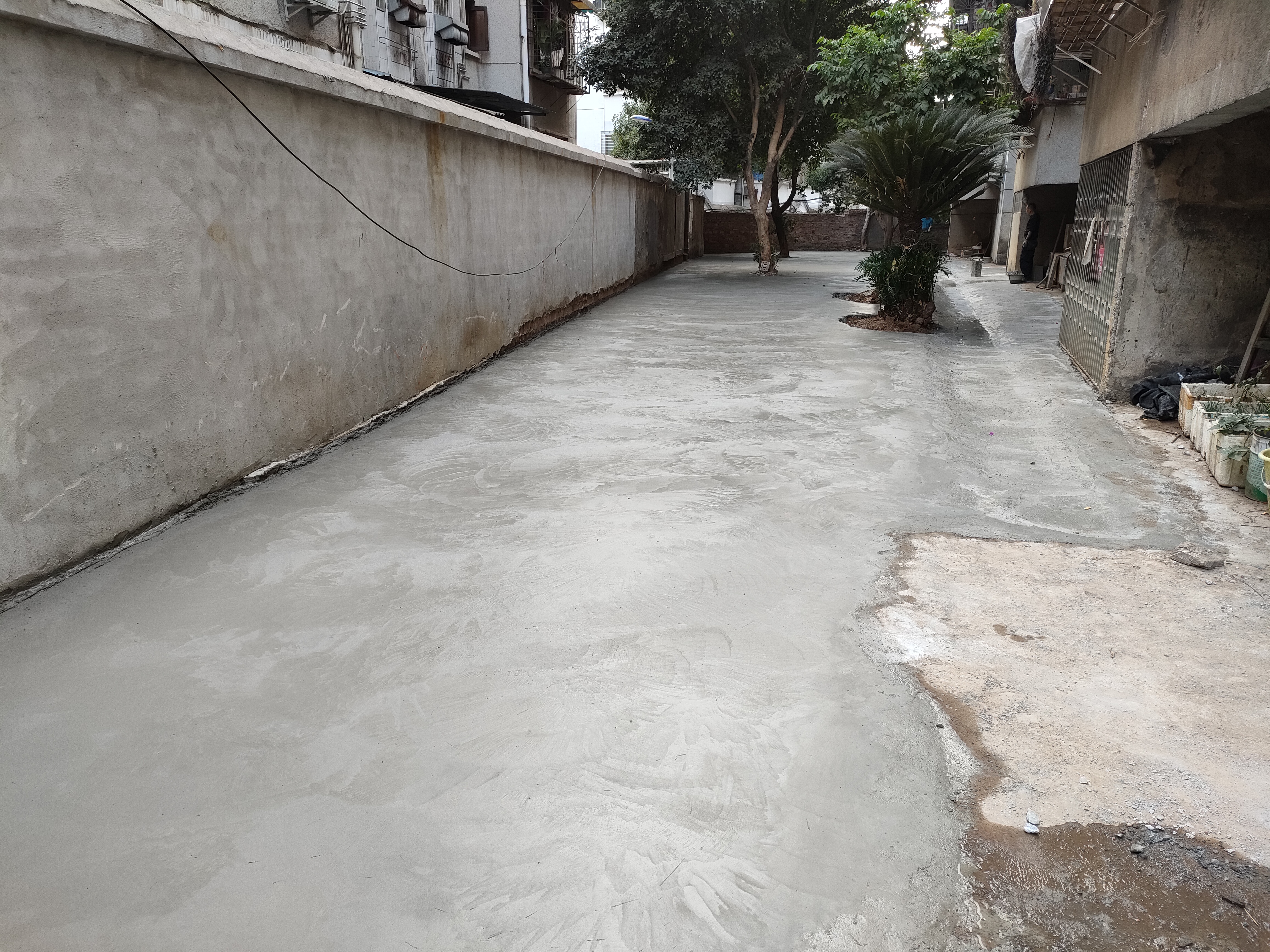 硬化过程中,工人对路面进行清理、开挖、铺沙、水泥灌浆硬化,社区工作人员协调维持所修路段的周边秩序,保障施工正常进行。通过大家的共同努力,经过几日的紧张施工,破损的路面得到了有效修复硬化。此次硬化工程还将楼栋旁的围墙进行拆除整修,加固围墙。最终,倾斜开裂的围墙成功拆除并搭建新的围墙。
