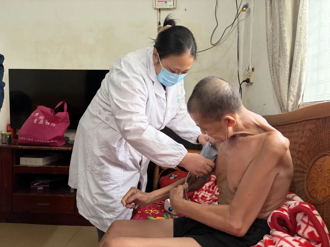 得知这一特殊困境后,村委会民政负责人莫志鹏第一时间与街道办沟通,双方迅速联动,街道办公共服务办公室主任彭国群主动对接辖区医院,反复协调沟通入户诊疗事宜。医院充分考虑该家庭的特殊情况,当即安排经验丰富的医护团队,携带专业医疗设备前往低保户家中。