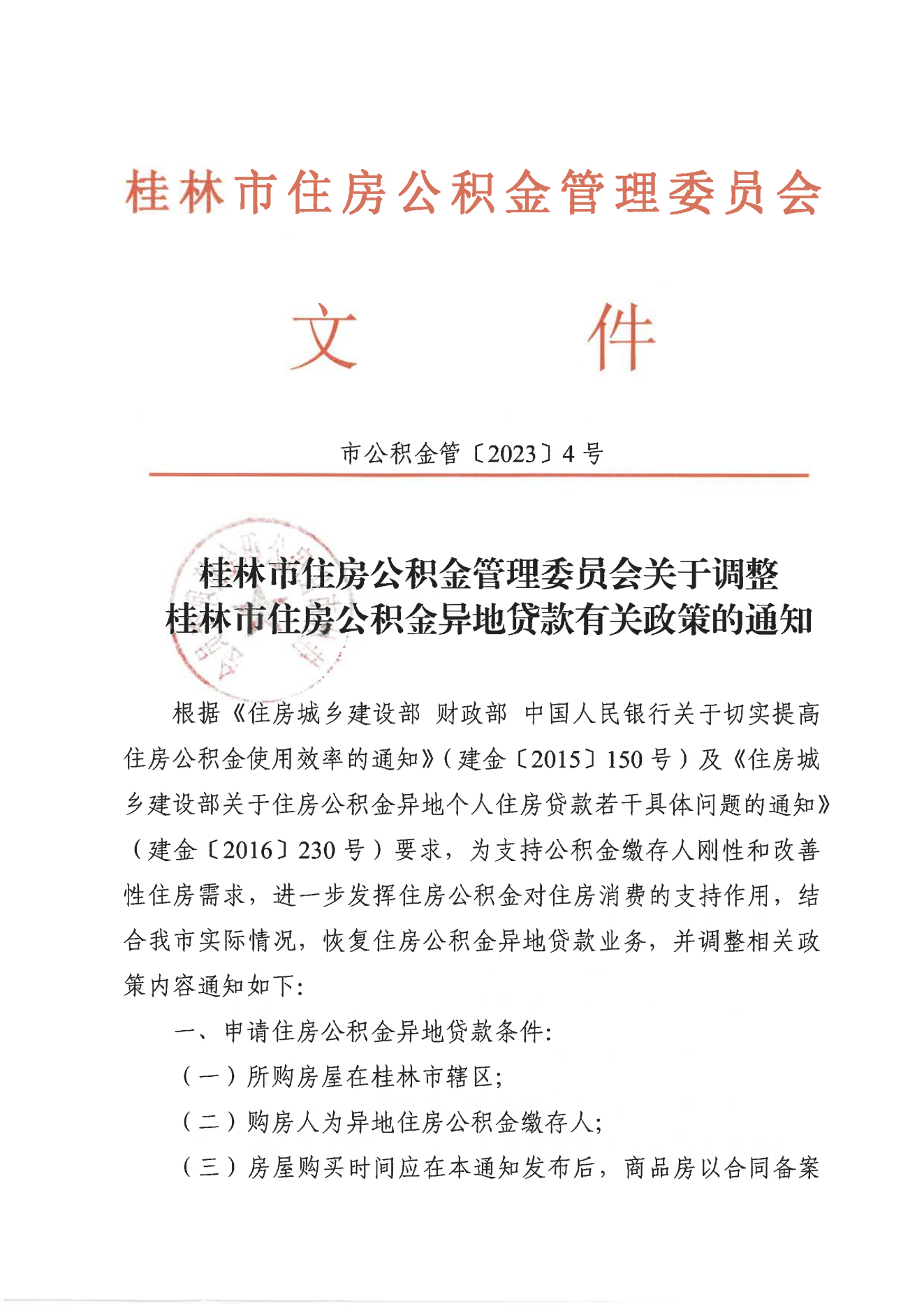 桂林市住房公积金管理委员会关于调整桂林市住房公积金异地贷款有关政策的通知(市公积金管〔2023〕4号)