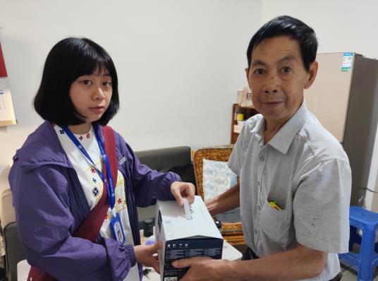 慰问过程中,社区志愿者带着慰问品走进老人家中,轻声询问他的治疗进展,仔细倾听他讲述身体状况,关切地叮嘱老人注意合理饮食,夏日不要贪凉,适度进行活动,始终保持乐观积极的心态。同时,为老人送上一箱牛奶。张伯伯高兴地和志愿者说:“谢谢你们来看我关心我,我很感动!”