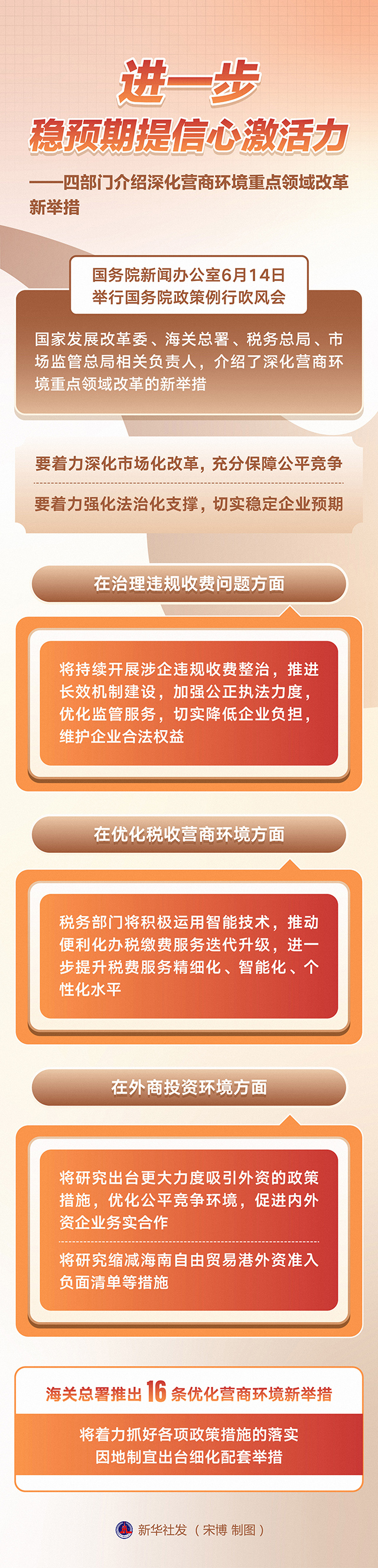 近日召开的国务院常务会议,听取优化营商环境工作进展及下一步重点举措汇报。国务院新闻办公室6月14日举行国务院政策例行吹风会,国家发展改革委、海关总署、税务总局、市场监管总局相关负责人,介绍了深化营商环境重点领域改革的新举措。