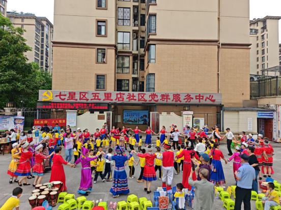 随着欢快的新疆伴奏响起,桂疆籍流动党员拜合提妮萨吾守尔带领大家载歌载舞,各民族的大朋友、小朋友自发手拉手,围成一个大大的同心圆,伴着欢快的民族音乐踏歌而动。不同年龄、不同民族的脸上洋溢着同样的笑容,不同民族的文化在这一圈圈的旋转中交融,一声声欢笑里,民族团结的情谊愈发深厚。