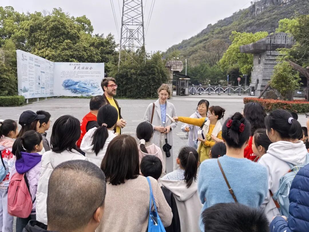 活动特别邀请了两位德国外教老师参与,让孩子们沉浸式体验双语研学。外教老师与志愿者耐心引导孩子们用简单的英语口语进行交流互动,清脆的童声与流利的外语对话交织,成为研学路上一道独特的风景线。