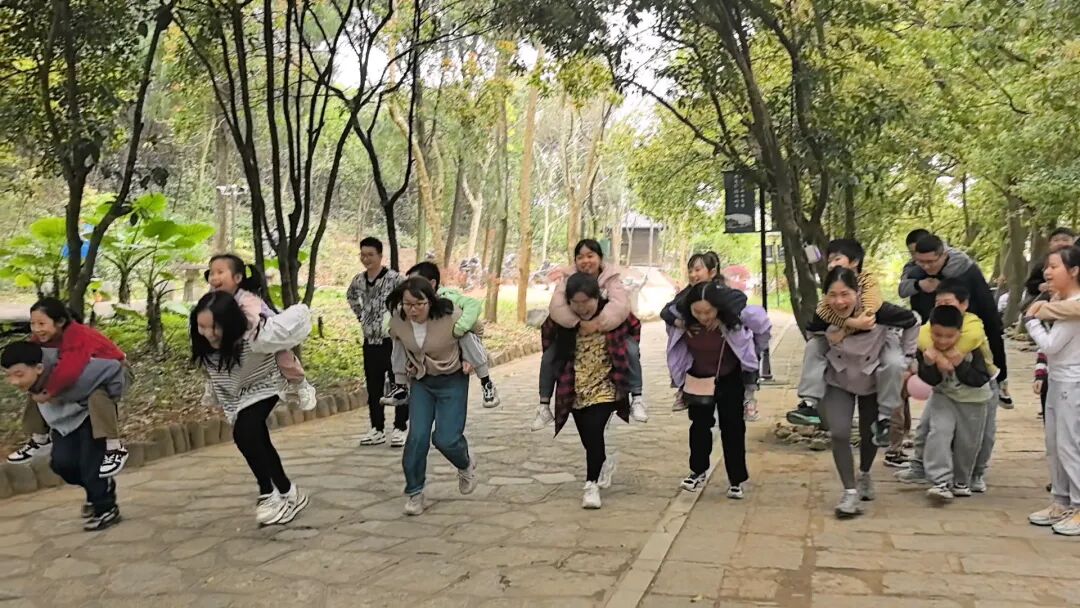 参观结束后,趣味十足的亲子运动会拉开帷幕。“猪八戒背媳妇”“猫抓老师”“吹气球”“大风吹”等多个亲子互动项目轮番上演,家长与孩子默契配合、并肩协作,现场欢声笑语不断,掌声、欢呼声此起彼伏。孩子们在奔跑嬉戏中释放活力,家长们在陪伴互动中重温童年乐趣,活动充满了温情与欢乐。